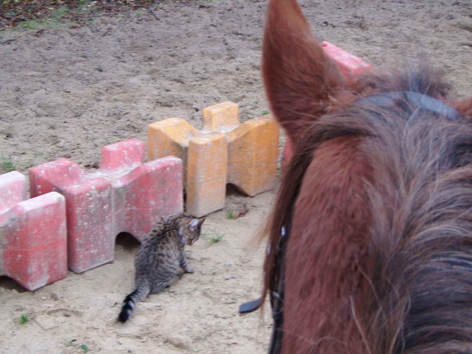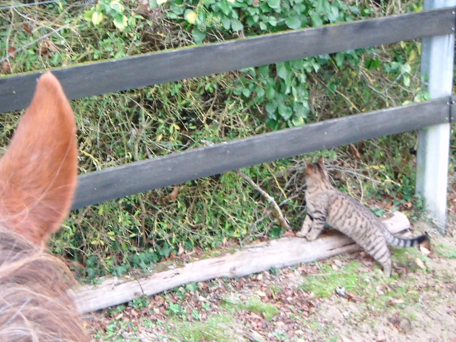 chat va pas être facile de travailler! 17 Janvier 2015 où quand le jeune chat du voisin d'invite dans la carrière cela donne une séance de travail sérieusement allégée! en version "évite le tigre"! et joue à cache cache avec lui! vu... et revu...! bref, on s'amuse à 3 et dans la série équilibriste, un bon concurrent! la bête ne bouge plus, on va pouvoir travailler un peu en le gardant à l'oeil... raté, le voilà reparti pour un tour! et dans la série envie de jouer, le petiot a l'air pas mal!Bref, on "chat"muse! Tag(s) : #un cheval des chats des chiens