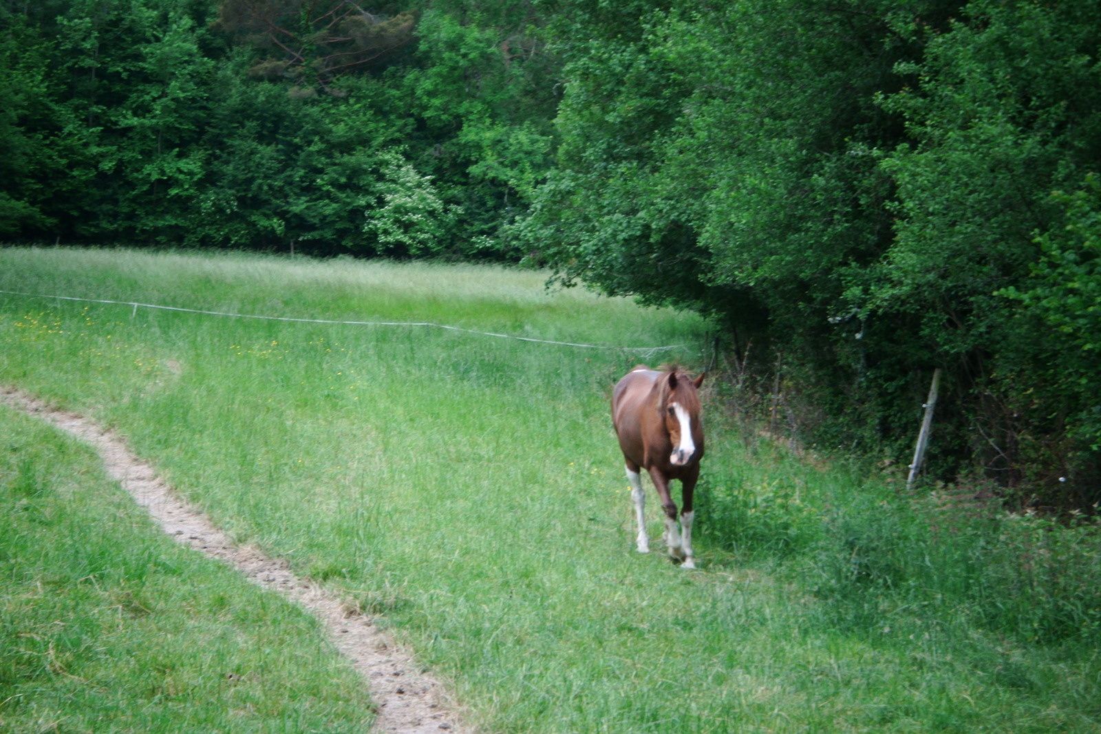 Ne marche pas la bouche pleine! 1 Juillet 2015 quand la mâchoire rythme les pas! Eros oublie même de suivre le chemin tracé au fil des années dans le pré! une nouvelle piste à venir? Au secours! Déviation crocodile dans la haie (rien vu ni entendu pour ma part, comme d'hab, pas les mêmes fréquences!) bon, en fait, même pas peur, mais sur ses gardes tout de même! et finalement de retour sur le chemin! en version pas d'arthrose dans l'encolure, mais des moucherons agaçants! et pas plus envie que cela de quitter la copine! Tag(s) : #un cheval au quotidien...